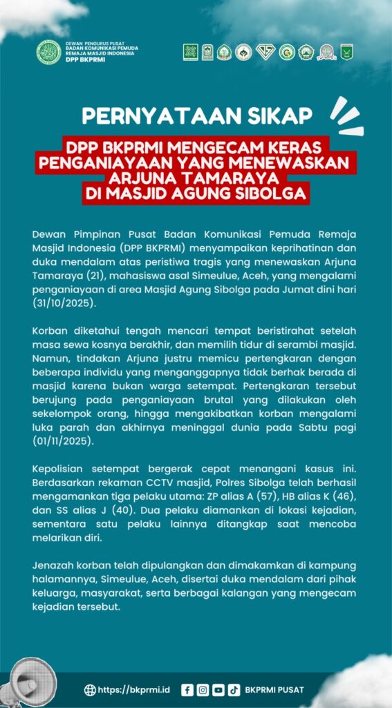 Jakarta — Dewan Pimpinan Pusat Badan Komunikasi Pemuda Remaja Masjid Indonesia (DPP BKPRMI) menyampaikan keprihatinan dan duka mendalam atas peristiwa tragis yang menewaskan Arjuna Tamaraya (21), mahasiswa asal Simeulue, Aceh, yang menjadi korban penganiayaan di area Masjid Agung Sibolga, Jumat dini hari (31/10/2025).