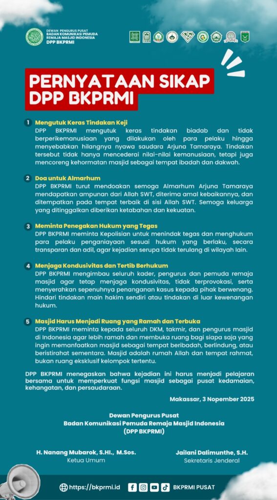 DPP BKPRMI mengutuk keras tindakan biadab dan tidak berperikemanusiaan yang dilakukan para pelaku hingga mengakibatkan hilangnya nyawa Arjuna Tamaraya. Tindakan tersebut tidak hanya mencederai nilai-nilai kemanusiaan, tetapi juga mencoreng kehormatan masjid sebagai tempat ibadah dan dakwah. - Doa untuk Almarhum